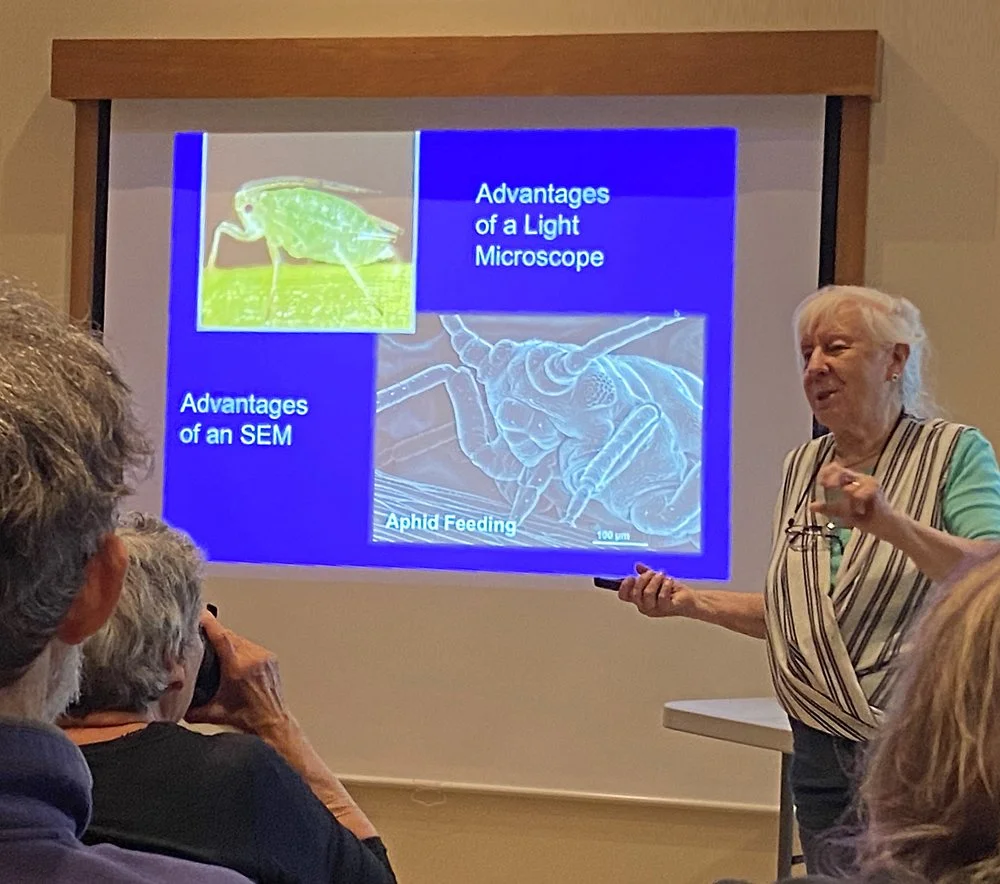 In 2023 Nature Salt Spring brought Dr. Elaine Humphrey and she brought the University of Victoria Mechanical Engineering’s Scanning Electron Microscopeto the Island for a wonderful look at the small organisms and micro-worlds of Salt Spring. The program at Blackburn Lake was a huge success, involving field trips, collections, and up close and personal viewing (as a group) of living things that only a few biologists ever get to see. We even had a number of young folks controlling the Microscope while the rest of us looked on in amazement. (Can you imagine what it wold look like to fill a huge projecting screen with views of stinging nettle spikes?)